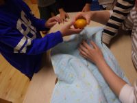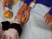 「いまから、箱の中に果物か野菜を一つ入れるので、手で触って何が入っているか当ててみてね。」