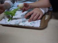 手の感触で、大きさや形から何の果物か野菜かを考えて・・・