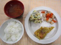 白身魚のカレー風味揚げ 高野豆腐の煮物 さつま芋サラダ ウインナーのコンソメスープ