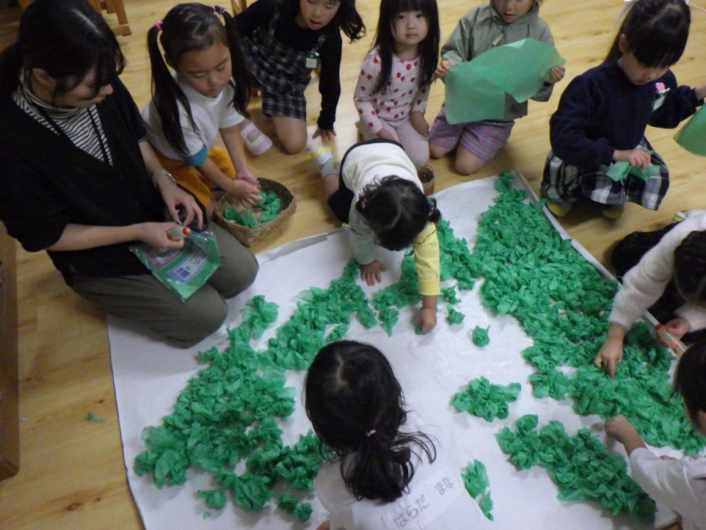 「お部屋に大きなクリスマスツリーを作ろう!」 と、あるクラスでは今週 数人のお友だちと先生とでクリスマスツリーの製作を楽しんでいました。 緑色のお花紙を...