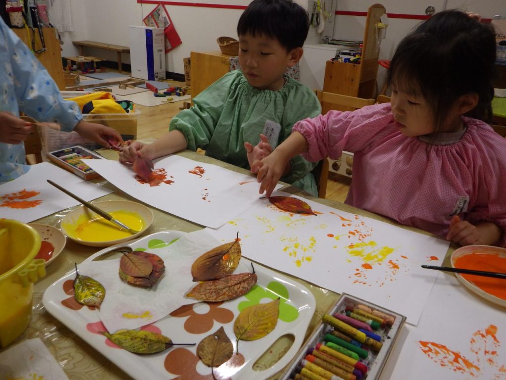今日は、幼稚園の園庭の落ち葉を使って製作を楽しんでいるクラスがありました。 葉っぱに絵の具をつけて画用紙にペタッと貼ると・・・ 葉脈の模様が出てとても綺...