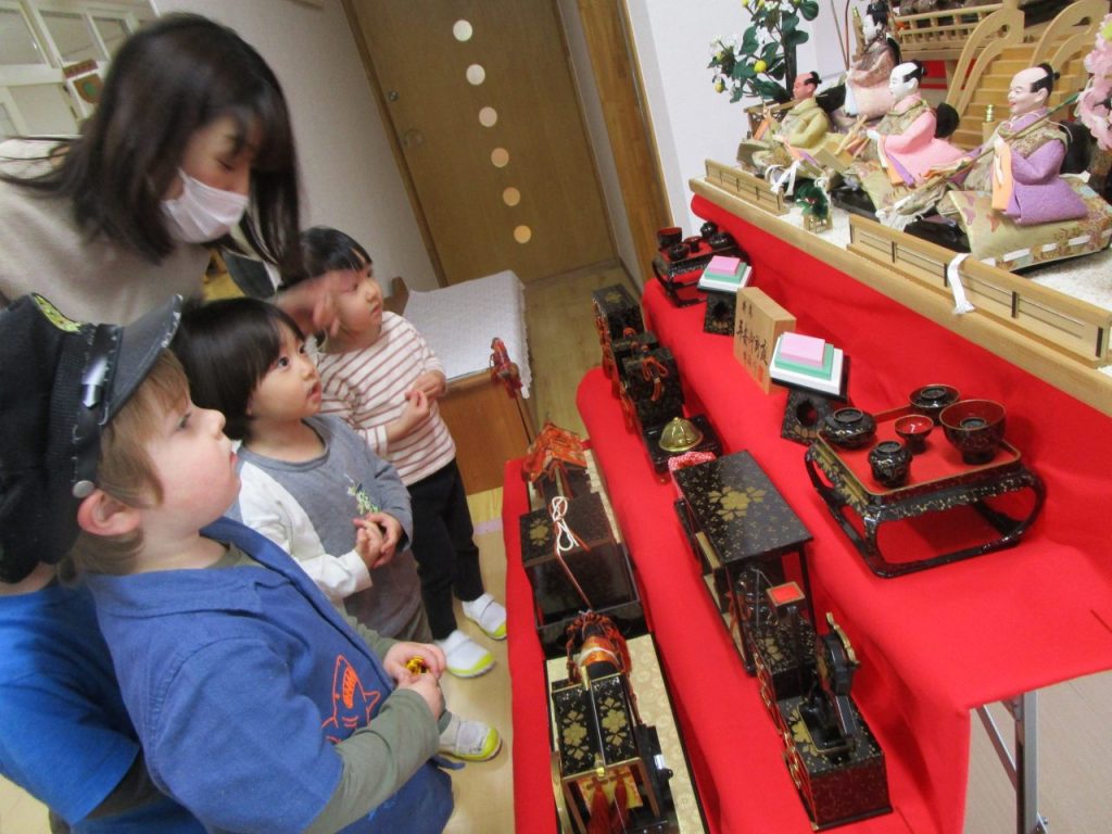 先週の金曜日の保育後、職員でお雛様を飾りました。 卒園生の保護者の方よりご寄贈して頂いたもので、7段のとても立派なお雛様です。 早速、登園したお友...