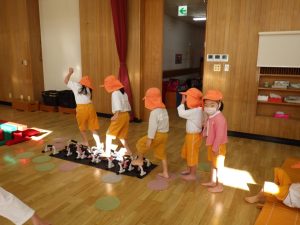 「よし、今からお花見しよう!」と、先生が呼びかけると お花見に必要な物を準備して早速園庭へ。