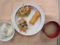 カレー春巻き キャベツと蒸し鶏の和え物 きのこのソテー 大根と人参の味噌汁
