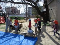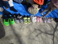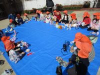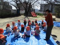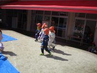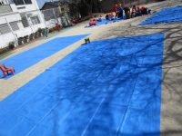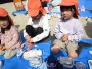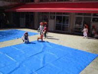 園庭にブルーシートを敷いて準備をしていると、子どもたちがやってきましたよ。
