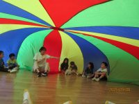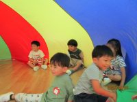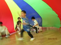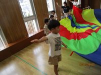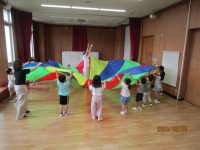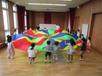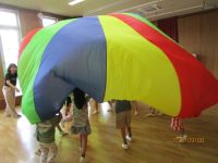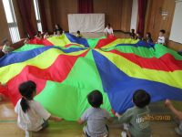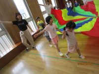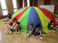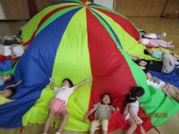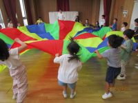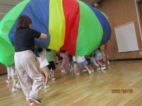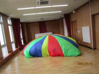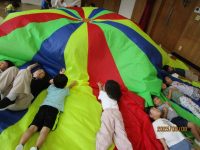 礼拝堂へ移動してパラバルーン遊びを楽しんでいるクラスがありました。