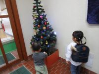 そして今日、登園した子どもたちは玄関のツリーや飾り、お部屋の中の飾りにもすぐに気が付いて触ってみたり眺めたりしながら楽しんでくれていましたよ。